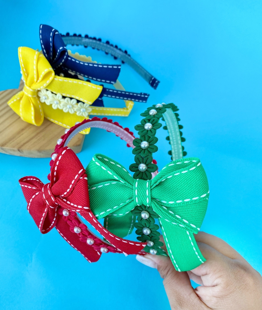 Tiara flexível, inquebrável, com forração em fita jeans colors, laço lateral e aplicação de flores e meia pérola.